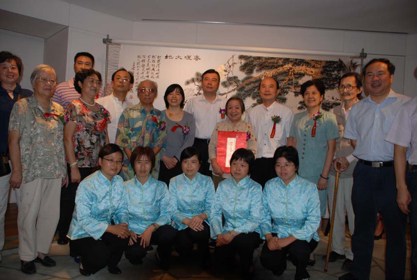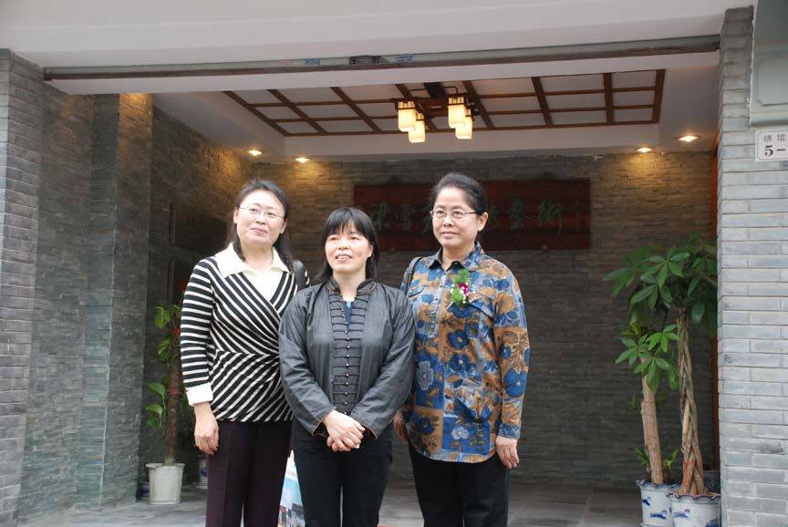梁雪芳与中国国家博物馆藏品保管二部主任、党支部书记朱珠(右1)、中国国家博物馆藏品保管二部征集室主任尹毅玲(左1)在梁雪芳刺绣艺术馆合影