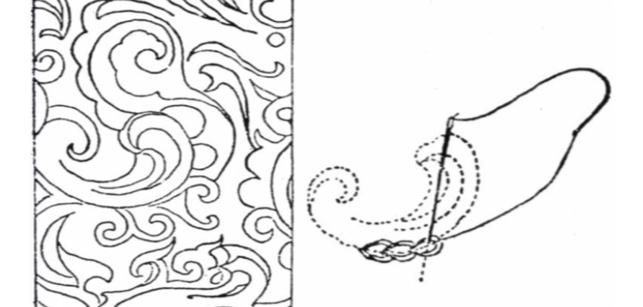 辫子股的名称比较复杂,也叫辩绣、锁绣、民间则流传更多的名称有拉梭绣、连环针、穿花、套花、锁花、络花、扣花、拉花等等。锁绣的发源最为古老。陕西宝鸡茹家庄西周墓出土的刺绣印痕即是辫子股绣;湖北江陵一号楚墓的大批绣品绝大多数是辫子股绣。可以说,在汉代以前,辫子股绣占据着中国刺绣的主导地位。这种针法易于表现流畅圆润的线条,密集排列又可组成具有肌理效应的体面,而且简便易学,至今仍为民间刺绣的常用针法。