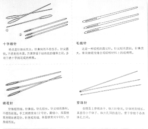 绣针多为钢质,按所绣品种分类,有绣花针、穿珠针、十字绣针和毛线针等。选择绣针时,要注意针与线、布的合理搭配。丝绸和细、软、薄的布料要用细小的针,穿细的线。粗针带细线会在绣地上留下难看的针眼,细针带粗线,从绣布上拔针时相当费劲。