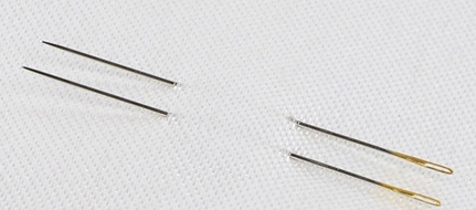挑选绣花针时,要特别注意针的两头,即“针鼻”和 “针尖”。针鼻应为椭圆形,若呈长方形或尖圆形,则易咬线,也易把线割断;针尖应以细长为佳。