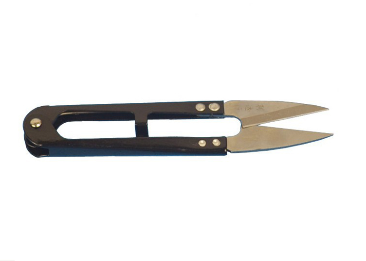 弯头剪刀:用来剪线头的剪刀,剪身小,刀口锋利,刃尖细长而呈弯曲上翘形,可以避免在剪线时刺破绣面。