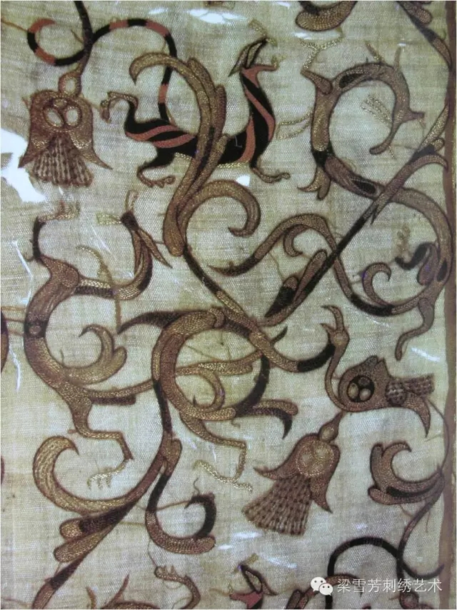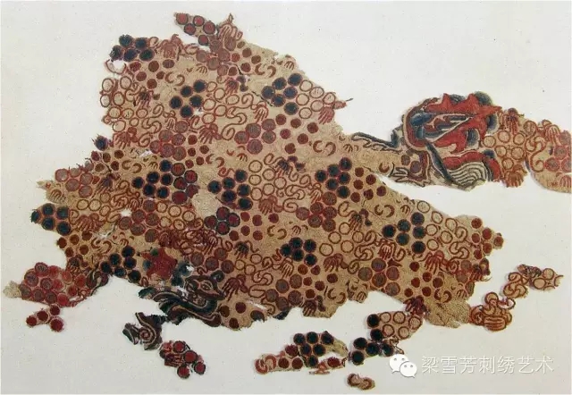 目前能看到的刺绣实物最早的当然要数荆州战国楚墓出土的“龙凤虎纹绣罗”了。这是一幅罗地上用锁绣法表现的作品,保存完好。另外还有同墓出土的龙凤纹绣绢、湖南长沙烈士公园出土楚国刺绣,也保存得很完好,这是认识古代刺绣的最好资料。在稍后的汉墓出土文物中,绣品更多了,如马王堆西汉文物中就有绣花绢绵袍、黄绣花袍,所用绣线极细,是前所未有的。
